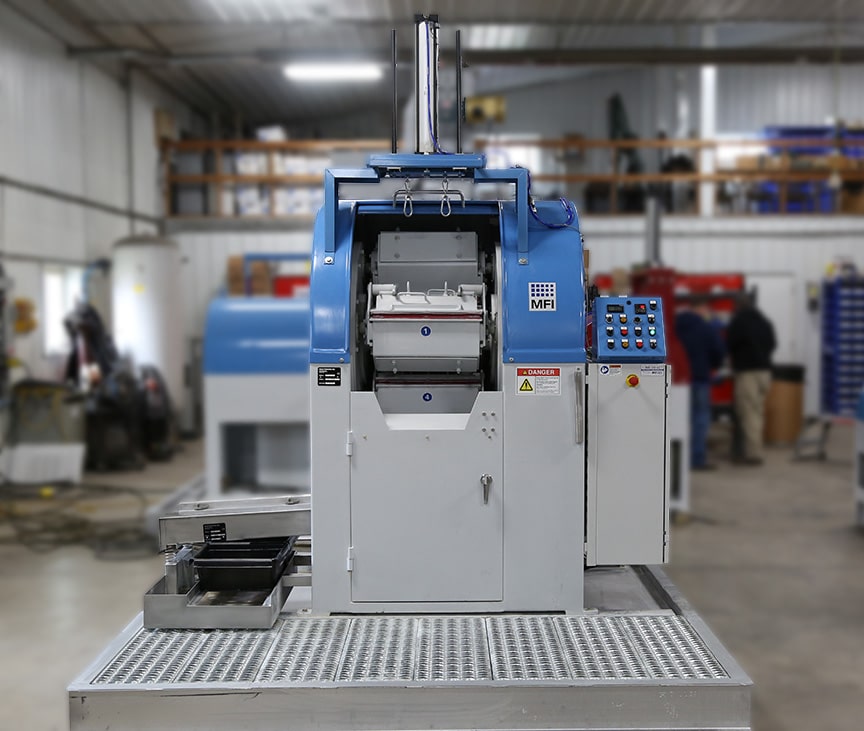 The HZ-120 is a full-sized industrial finishing machine known for its wide diameter and deep barrels. Its barrel diameter is over 4” larger than smaller models. With over triple the capacity of MFI’s compact machines like the HZ-40, you can finish larger and higher quantities of parts per cycle. Equipped with a cover lift, this model makes lifting the lid off your barrels a breeze.