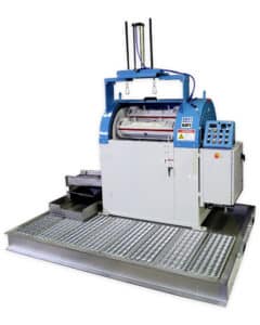 The HZ-60 Centrifugal Barrel Finisher features four 25.75” wide barrels. These barrels come with removable lids that are secured with cam locks for safe and efficient operation. Also, the machine is equipped with an air-driven cover lift that is controlled by a toggle switch located on the control panel. This feature, therefore, allows for easy removal of the barrel covers.